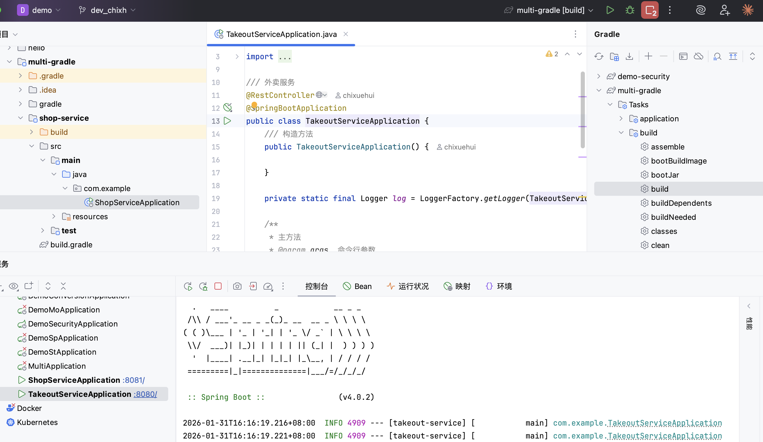 编写一个spring boot启动主方法和一个可响应hello方法 - 同理编写外卖服务子工程的构建脚本和应用代码,见takeout-service/build.gradle和TakeoutServiceAppliction.java