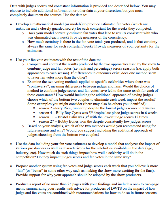 本题要求我们基于《与星共舞》电视节目已知的选手信息、比赛结果及各周评委评分数据,建立数学模型估算各选手在每周获得的未公开粉丝投票数。模型需能合理复现实际每周淘汰结果,并设定评估方法检验模型投票估计与实际淘汰一致性的程度。同时,需要评估估算出的投票总数和每位选手每周投票数的不确定性,并给出对应的定量指标。该问题需要结合评分机制、淘汰制度特点,将技术表现和明星人气影响综合加以建模分析。