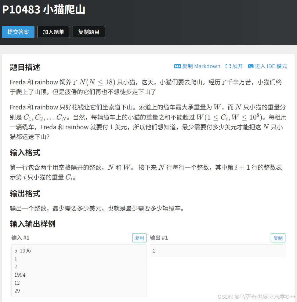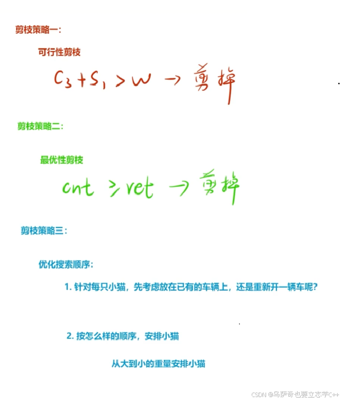 本质对于每一只猫就两种放法:放到已有的缆车中,或者重新开一辆缆车。但是本题的数据量比较大,所以需要进行剪枝,对于本题有三种剪枝策略: