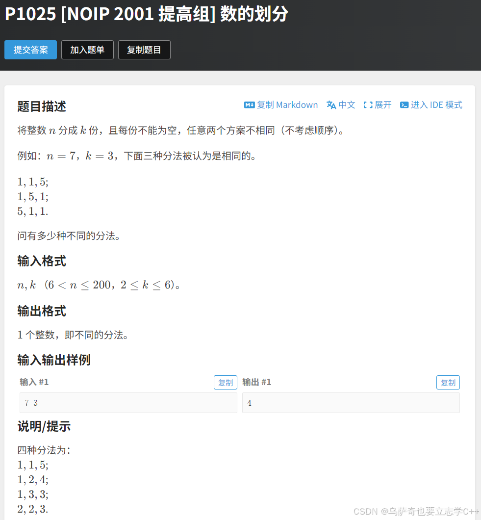 第一是排除等效冗余,例如先填1再填2和先填2再填1是同一种情况,需要剪掉,实现思路依旧dfs传递begin参数,但是本题在实际传参时应该传i,而不是枚举组合传递的i + 1,因为枚举组合题目是严格的组合,不能出现两个一模一样的数,但是本题可以出现两个一模一样的数,例如1 1 5。 第二是可行性剪枝,在dfs递归下一层时要先计算当前分支的最小值,然后和n比较,如果大于n说明此路径的最小情况都大于n,其他情况 只会大于等于n,所以需要直接剪掉。例如下图第一层中3往后所有情况都不满足,因为当第一个元素选3时最小情况都是3 3 3,结果为9大于7,所以for循环i枚举到3时可以判断后面3以及后面所有情况都不合法,直接剪掉。