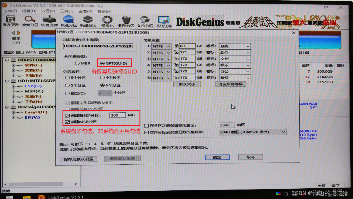 (后面我新建了,所以系统盘前面有两个分区,分别是ESP和MSR)