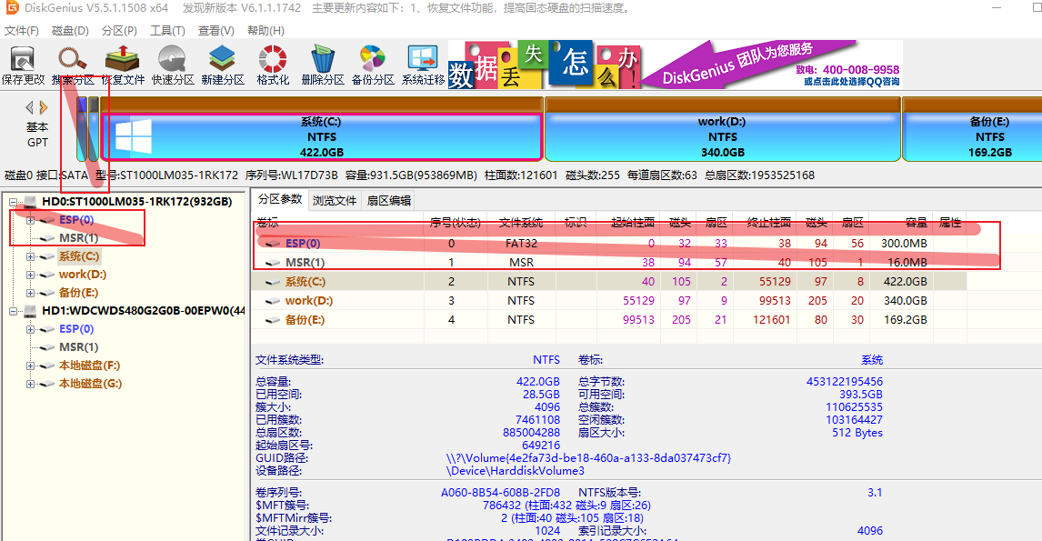 但是我在用DiskGenius看硬盘分区的时候,发现系统盘没有前面的两个引导页。