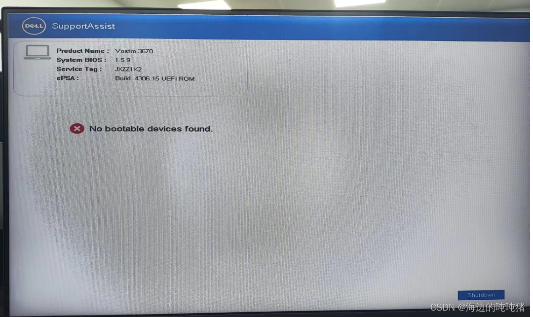 本文主要记录一下我定位和解决问题的过程。(另外,由于在修电脑的时候我有些东西忘记记录了,所以有些类似的情景我会从 戴尔电脑重装系统出现No bootable devices found的问题 中拿图,感谢这位作者嘻嘻 ^_^)