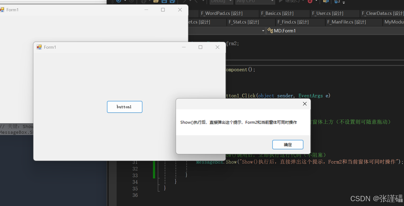MessageBox.Show("Show()执行后,直接弹出这个提示,Form2和当前窗体可同时操作");