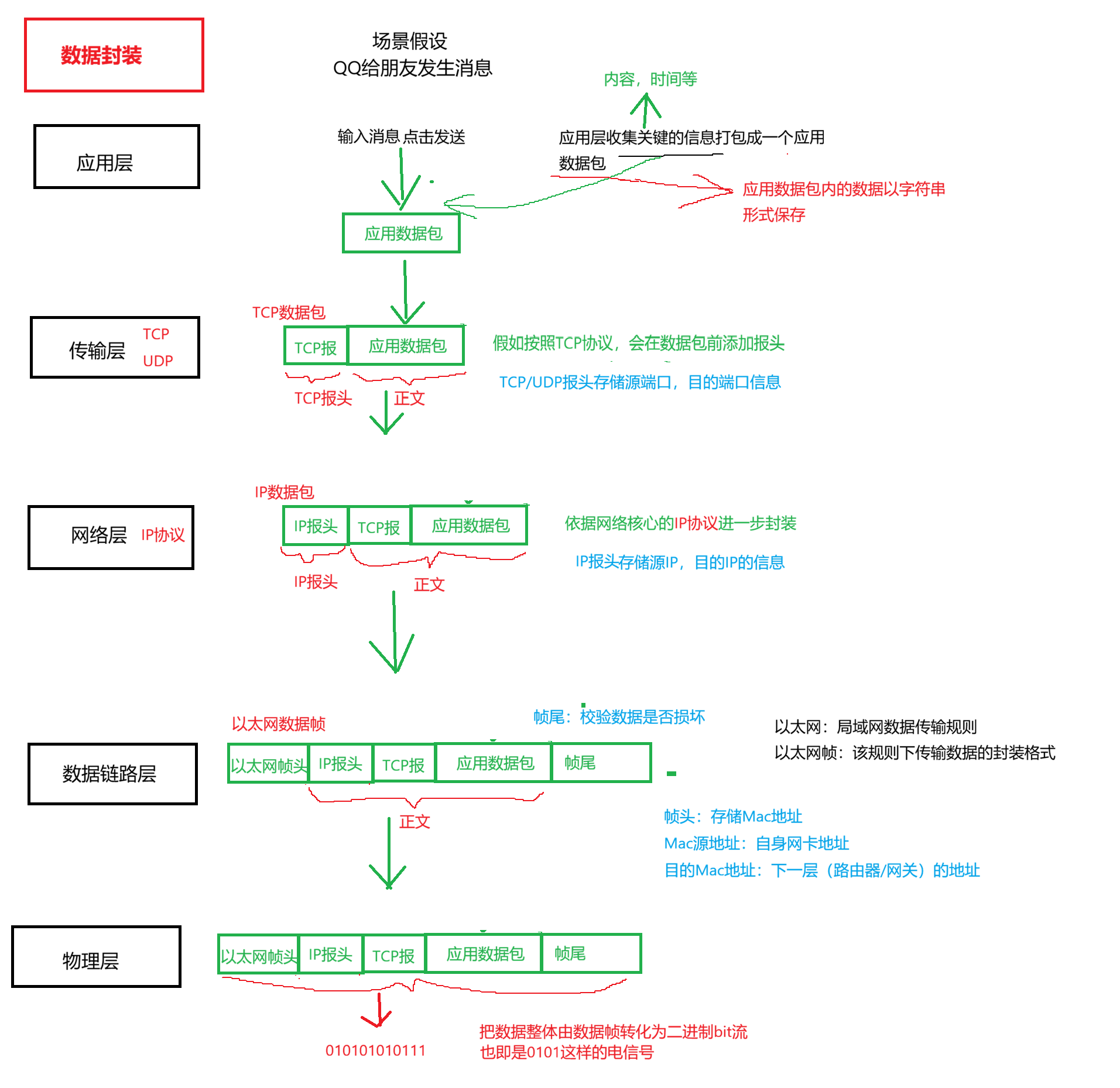 是指数据从应用层向下逐渐添加报头的过程。好比给快递包装的过程,也可以认为是一个在数据传递的过程中,数据不断变大的过程