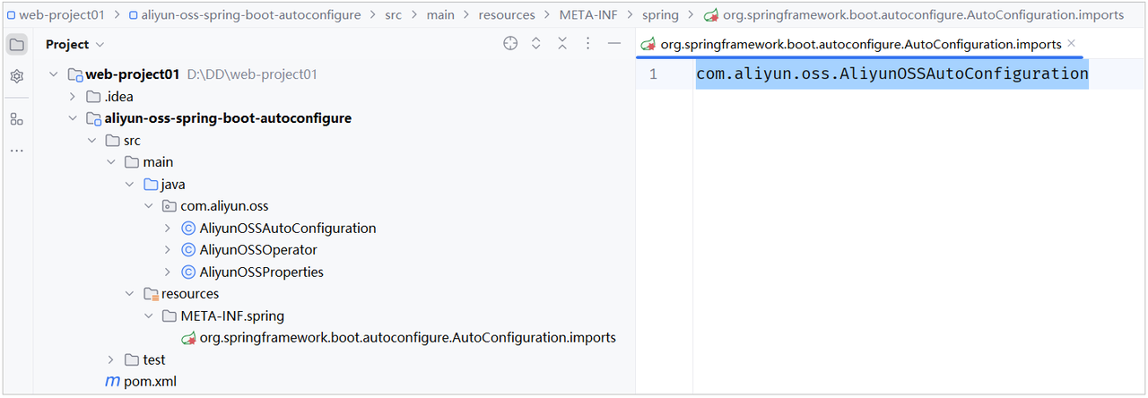 4). 在 aliyun-oss-spring-boot-autoconfigure 模块中的resources下,新建自动配置文件 META-INF/spring/org.springframework.boot.autoconfigure.AutoConfiguration.imports