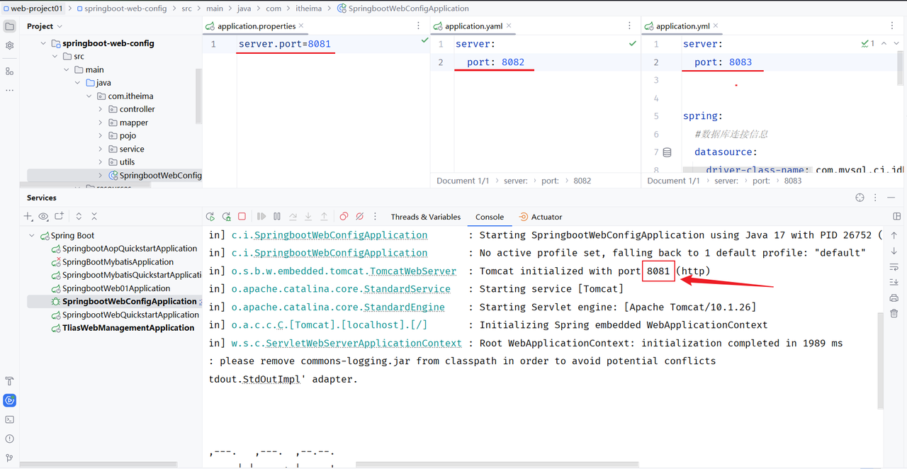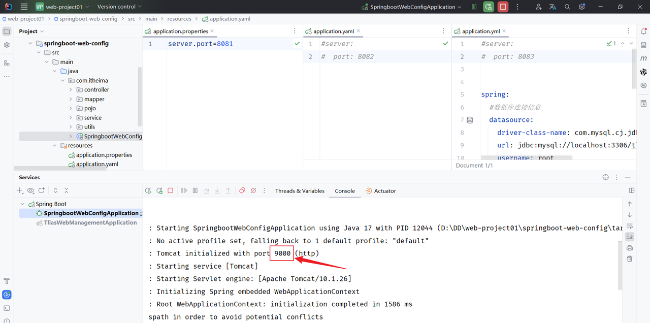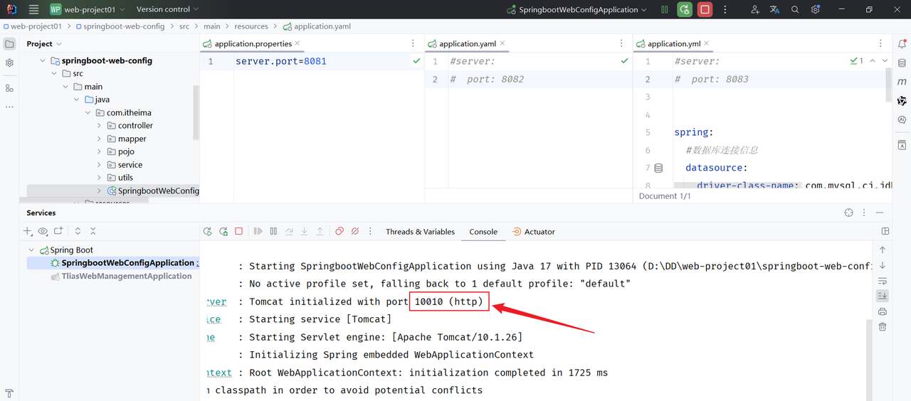 - properties、yaml、yml三种配置文件同时存在。 配置好了,启动服务,测试一下: