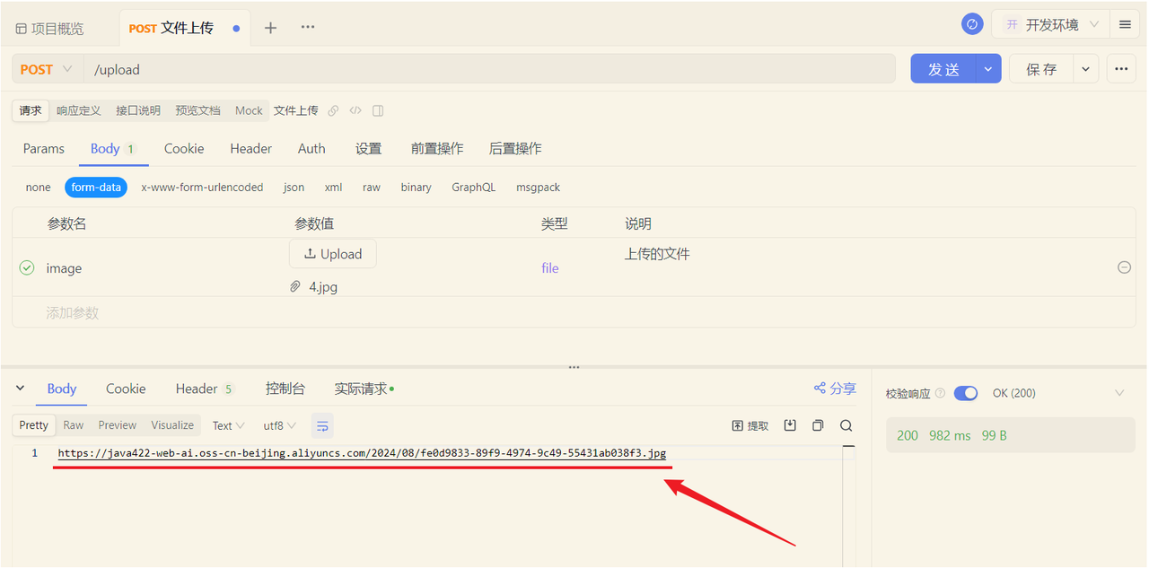 编写完代码后,我们启动当前的SpringBoot测试工程,使用Apifox工具进行文件上传: