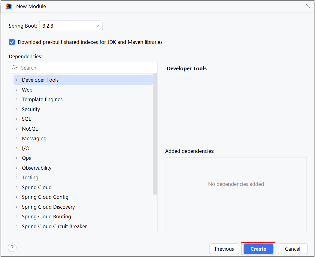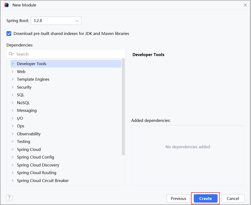 选择springboot的版本,不需要勾选任何的依赖。直接点击 create 创建项目。