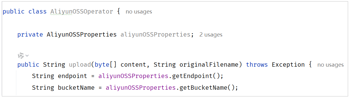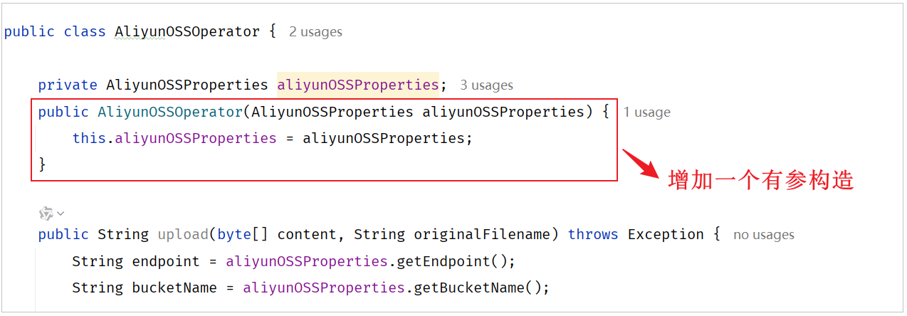 AliyunOSSOperator 的代码中需要增加一个有参构造,将 AliyunOSSProperties 对象传递给工具类。代码改造如下: