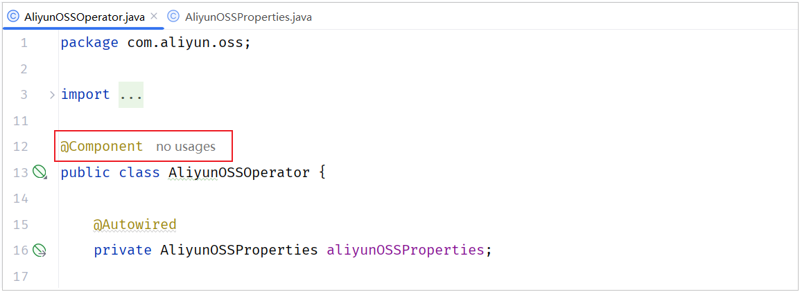 1). 删除 AliyunOSSOperator 工具类上的 @Component 注解 和 @Autowired 注解。