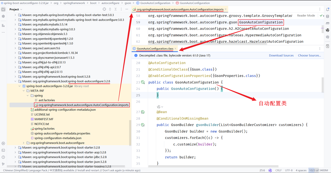 定义配置文件,把自动配置类的全类名定义在配置文件(