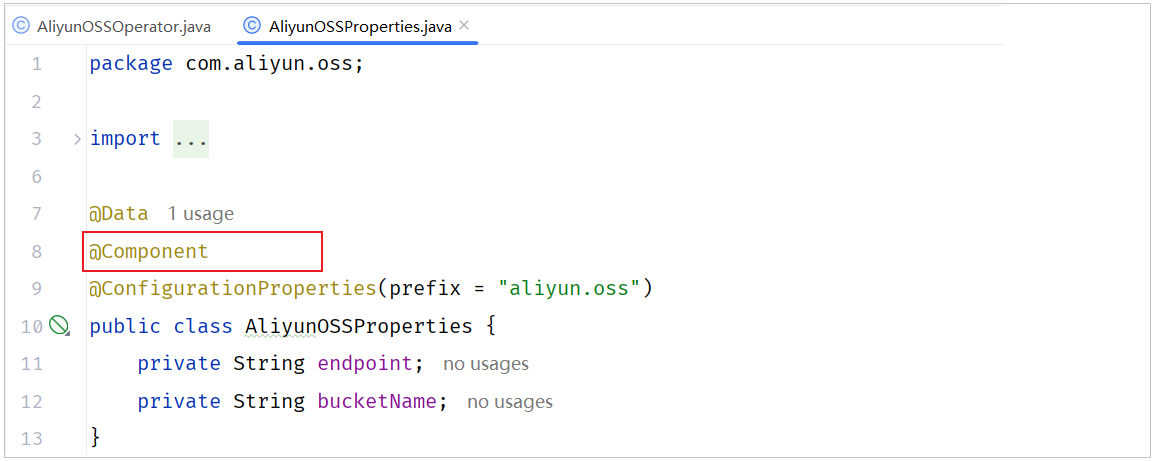 2). 删除 AliyunOSSProperties 实体类上的 @Component 注解。