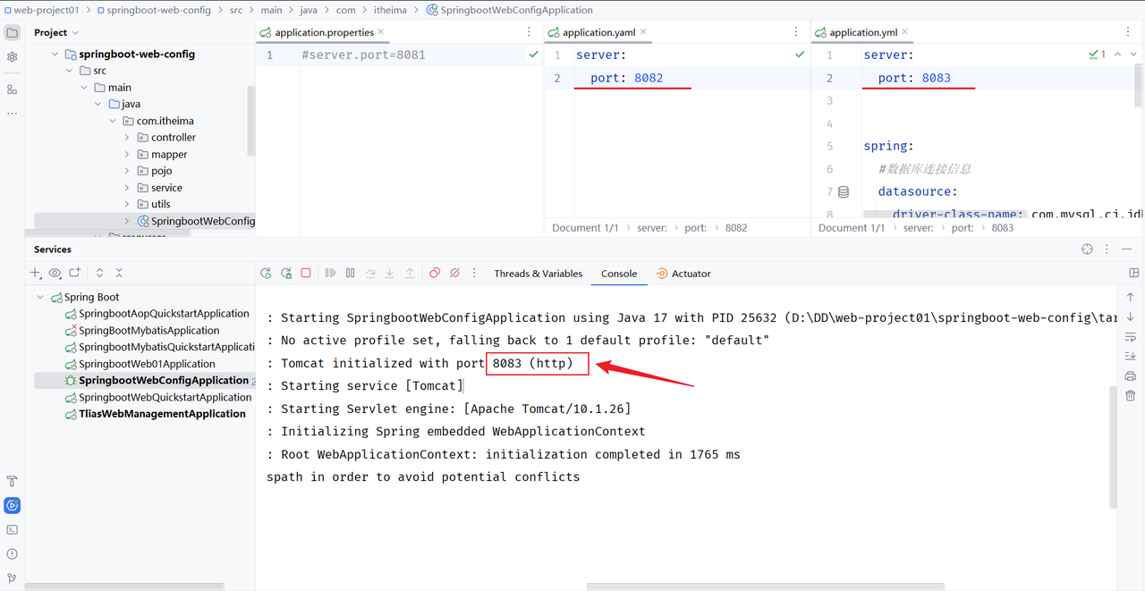 重启服务,同时配置Tomcat端口(application.properties、系统属性、命令行参数),测试哪个Tomcat端口号生效: