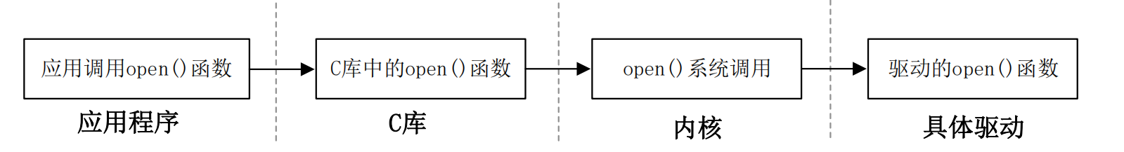 其中关于 C 库以及如何通过系统调用"陷入"到内核空间这个我们不用去管,我们重点关注的是应用程序和具体的驱动,应用程序使用到的函数在具体驱动程序中都有与之对应的函数, 比如应用程序中调用了 open 这个函数,那么在驱动程序中也得有一个名为 open 的函数。每一 个系统调用,在驱动中都有与之对应的一个驱动函数