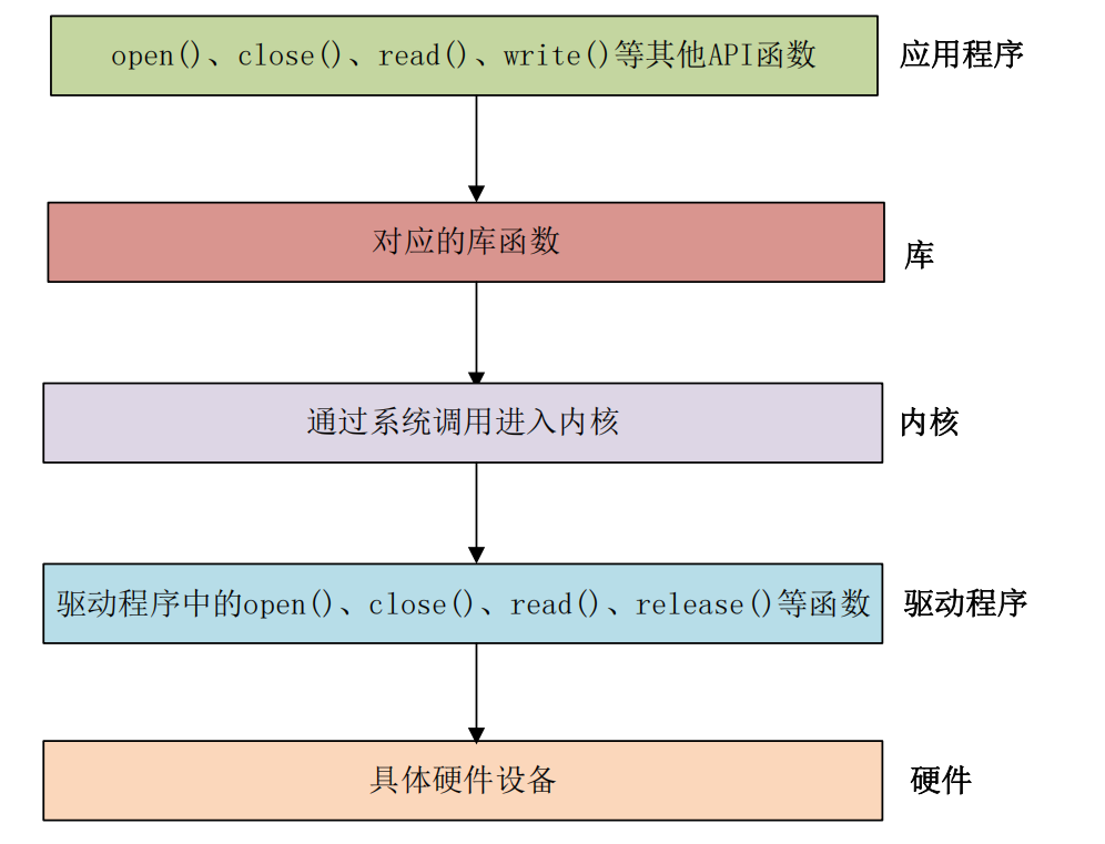 在详细的学习字符设备驱动架构之前,我们先来简单的了解一下 Linux 下的应用程序是如何调用驱动程序的,Linux 应用程序对驱动程序的调用如下图所示: