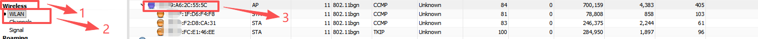 也可以通过左边菜单的 Wireless --> WLAN 来查看 AP-STAs 对应关系: