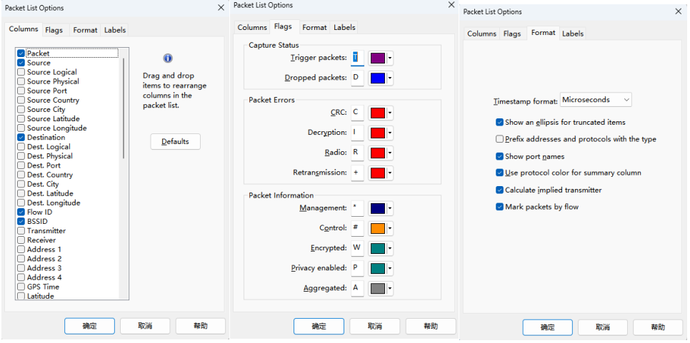 在Packets 窗口,通过右键点 packet list options 来选择要显示的信息,以及对应的 flags 定义,也可以改颜色