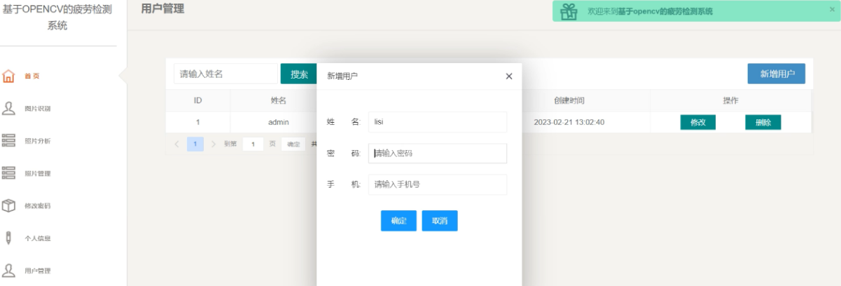 用户可以通过修改密码以及个人信息模块实现系统平台内个人信息的修改和管理,同时可以通过用户管理界面实现用户的在线新增,新增用户信息只需要填列用户的姓名、密码及手机号就可以实现新增操作