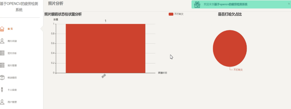 结合用户拍摄上传的图像内容,系统会统计眼睛状态、睁眼情况、打哈欠占比等内容数据,通过系统柱状图和饼状图的数据分析来帮助用户再次确认疲劳程度,借助照片分析数据信息的佐证来进行疲劳状态的复核