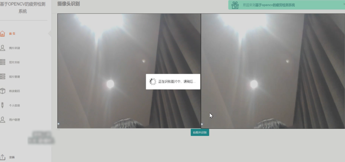 图片识别功能模可以通过摄像头识别的方式来对用户的进行人脸识别,用户可以通过拍照或者图片上传的方式来进行面部信息的捕捉,系统会结合用户拍摄的图片或上传的图片照片进行在线的表情捕捉,通过图片内容的智能识别来判断用户是否处于疲劳状态