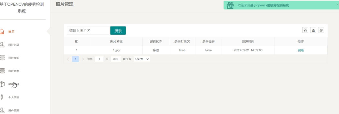 照片管理主要记录了疲劳检测系统上传图片内容,同时包括检测的结果反馈,内容包括了照片眼睛状态、是否哈欠以及是否疲劳的数据判断,可以通过照片管理界面来搜索照片信息,同时可以通过该界面对于拍摄上传异常的图片内容进行删除操作