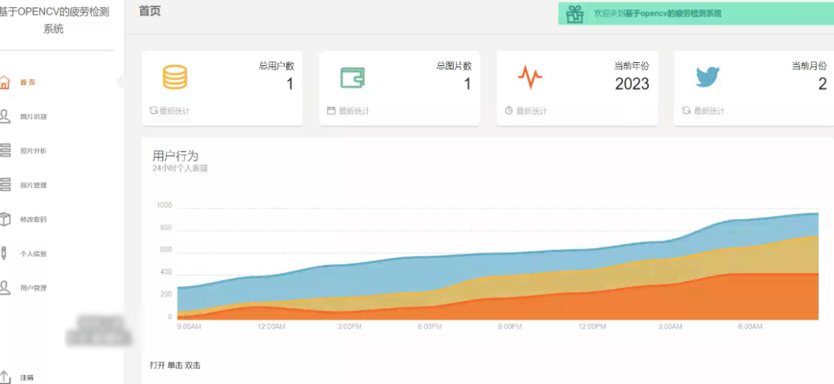 此次疲劳检测系统首页是系统平台的统计信息,内容包括了系统总用户数、总图片数以及当前年份月份,同时通过用户行为图表呈现了用户24小时个人表现数据,系统左侧导航信息包括了图片识别、照片分析、照片管理以及个人用户管理等功能模块