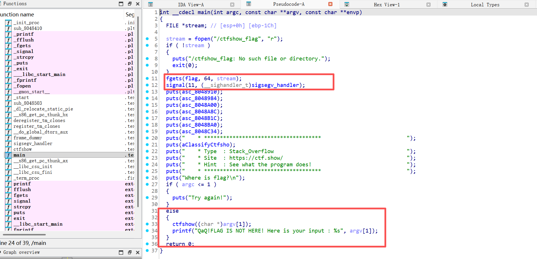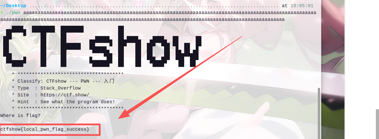 ctfshow函数接收了我们的输入。如果我们在那里制造溢出,程序就会崩溃,从而触发上面的机关。
