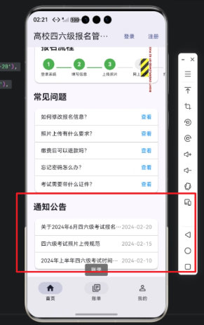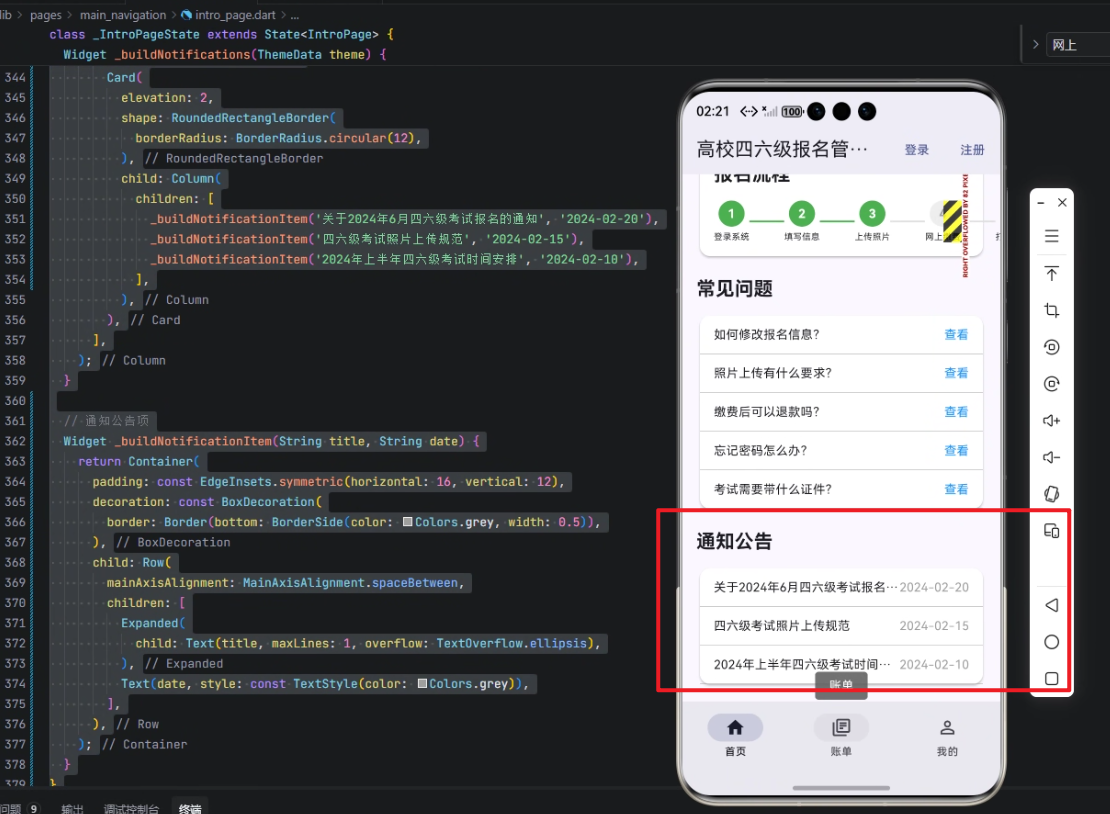 在现代高校信息化建设中,四六级报名管理系统是每年学生和教务部门关注的重点。随着移动端设备的普及,学生希望能够通过手机快速查看考试通知、报名信息以及重要公告。如何实现一个高效、可跨平台运行的移动端应用,成为技术实现的关键。本文将结合 Flutter × OpenHarmony 跨端开发框架,分享高校四六级报名管理系统中"通知公告"模块的实现思路和详细代码解析,帮助开发者快速掌握跨端 UI 构建技巧。