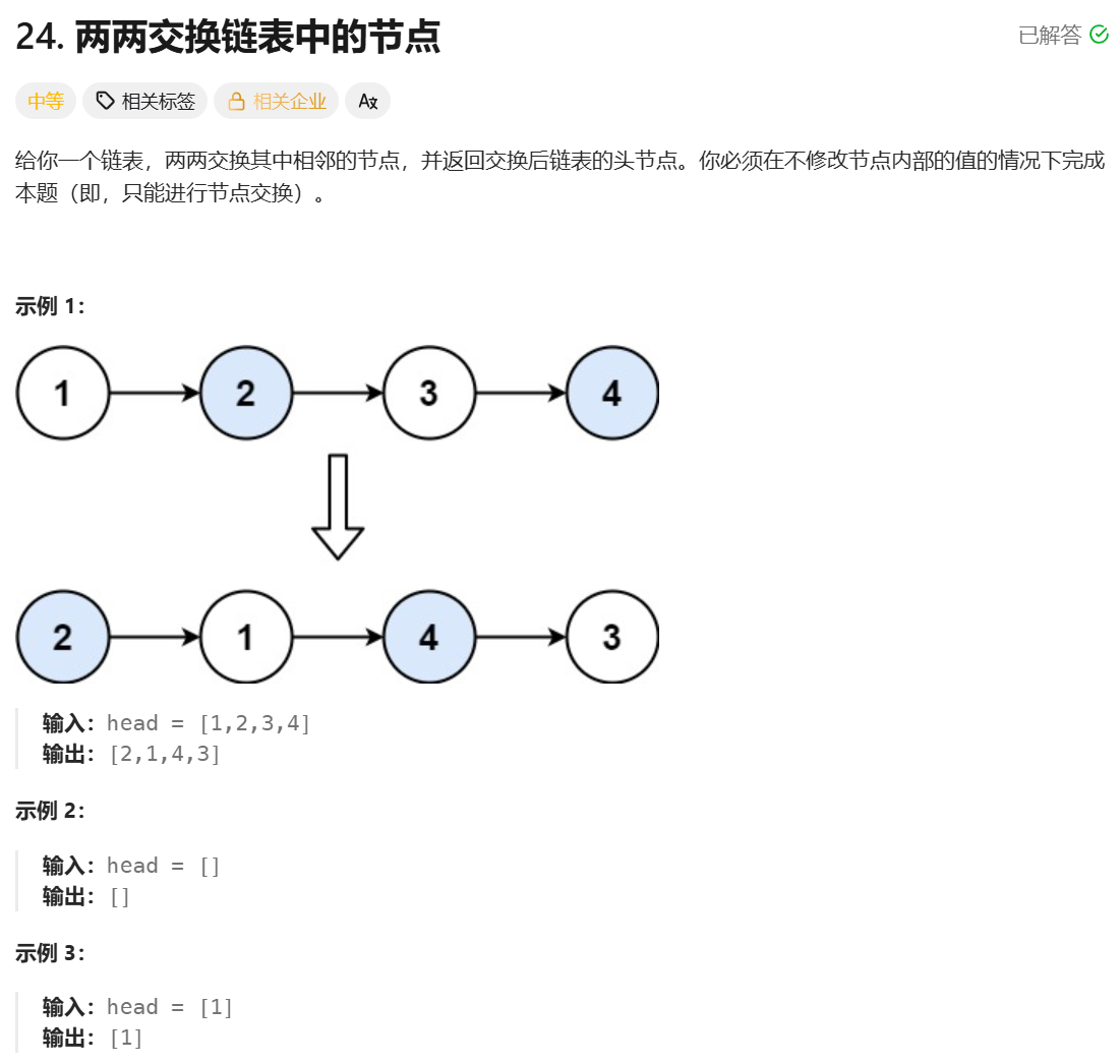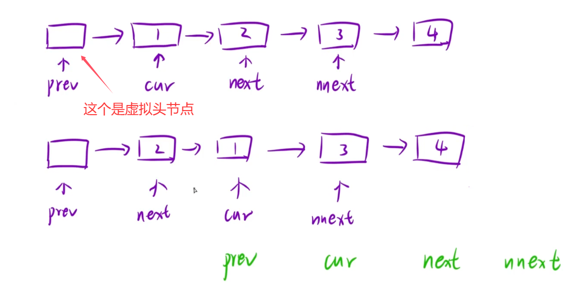 **思路:**定义一个虚拟头节点,然后定义四个指针,分别指向要交换的两个节点的前一个节点,要交换的两个节点,要交换的两个节点的后一个节点,通过这四个指针就能完成这两个节点位置的交换,然后再移动这四个指针指向下一对交换的节点,继续这个过程直到所有节点完成交换。