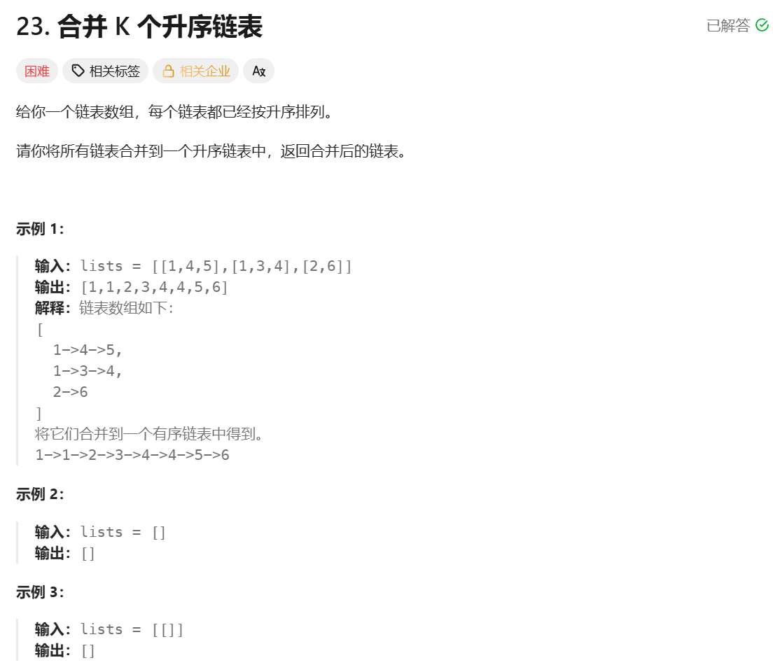 **思路:**这道题可以使用优先级队列来解决,创建一个小根堆,然后将所有链表头节点放入小根堆中,每次取出堆顶元素尾插到结果链表中,然后判断一下,如果取出的这个节点后面还有其他节点,将它后面的节点也扔入小根堆中(每次只扔一个)。另外,这个结果链表要有一个虚拟头节点,方便插入数据和返回结果时找到头节点。