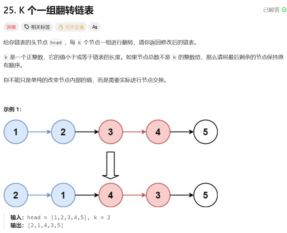 **思路:**先求出需要逆序多少组,然后重复 n 次长度为 k 的链表逆序即可。逆序还是使用创建虚拟头节点然后头插的方法就可以。
