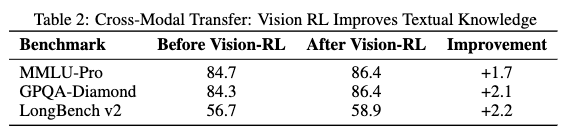 模态协同增强:首次系统验证视觉 RL 可反向提升文本推理能力,实现真正的双向跨模态迁移