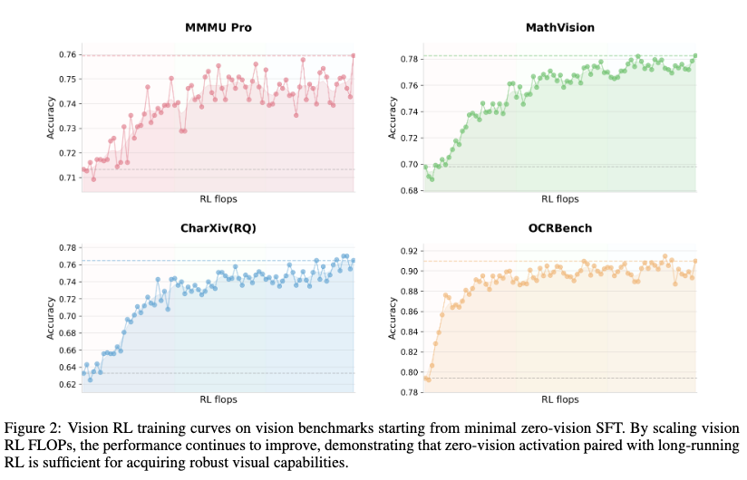 Zero-Vision SFT 启动后,通过长时程视觉 RL 训练,模型在 MMMU-Pro、MathVision、OCRBench 等基准上持续提升,证明纯文本激活足以获得鲁棒的视觉能力。
