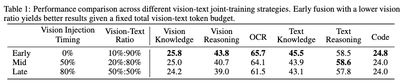 - 早期融合(Early Fusion):从训练开始就以固定比例(Vision:Text = 10:90)混合数据