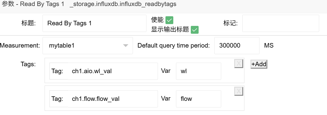 为了方便前端UI展示,我们准备一个请求能够同时获取"Read By Tags 1"的历史数据和部分标签的当前实时数据。因此我们选择"接入与设备"分类下的"标签数据读取"节点,放入绘制区,双击打开对话框修改如下内容: