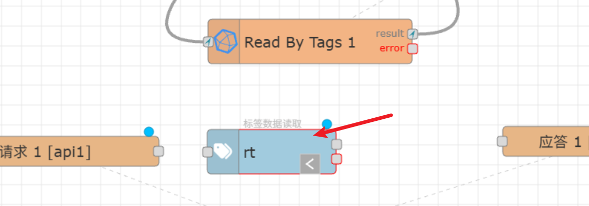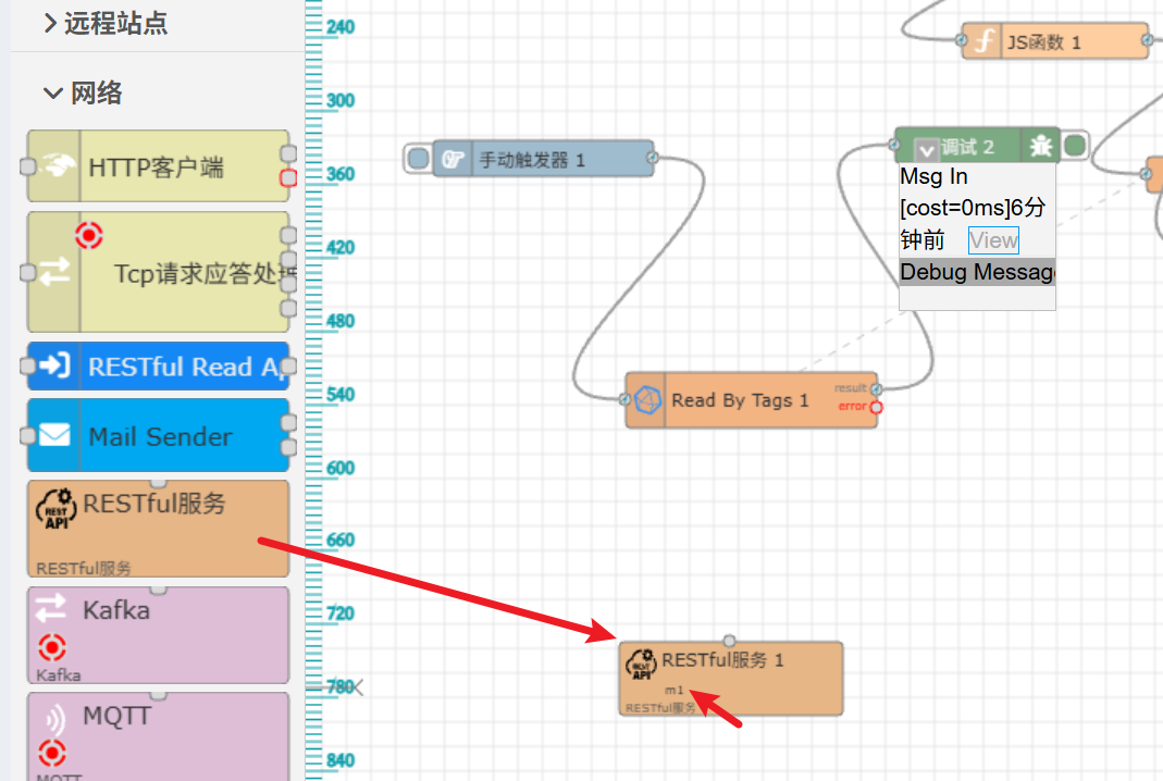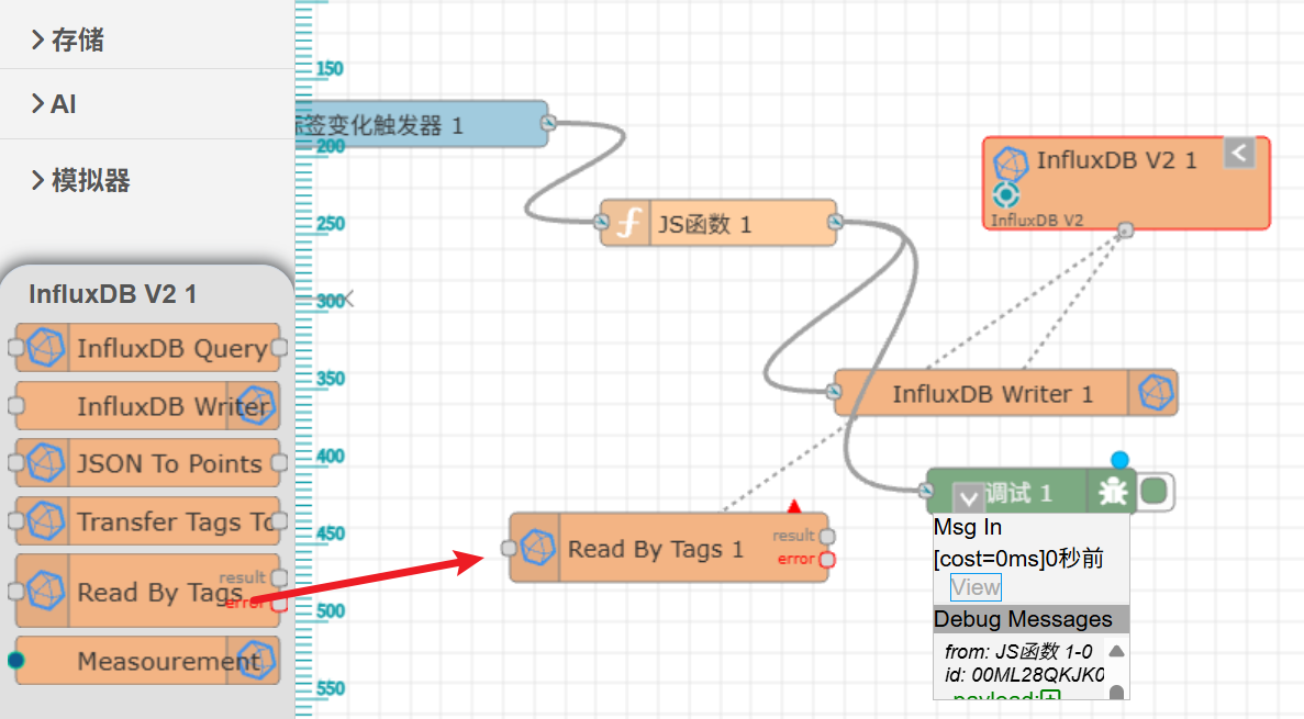 接着上一篇文章,我们在流程中再次选中"InfluxDB V2 1"这个节点,左边节点列表下方出现这个节点的子节点,选中"Read By Tags"拖拽到绘图区,如图: