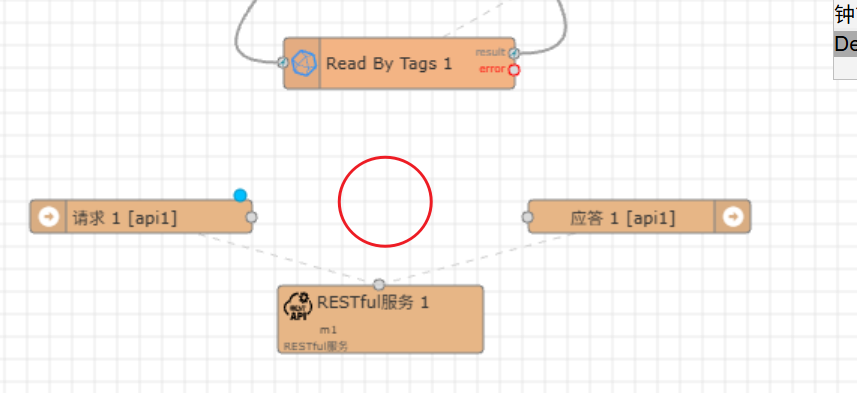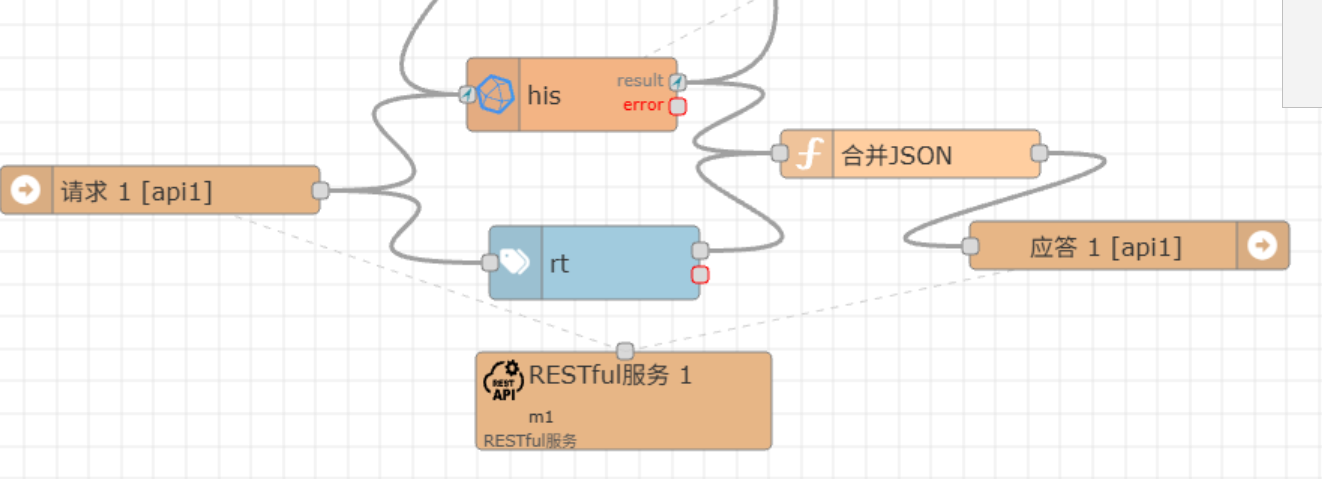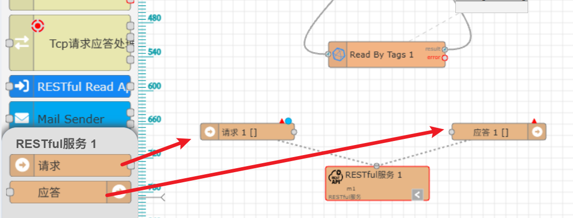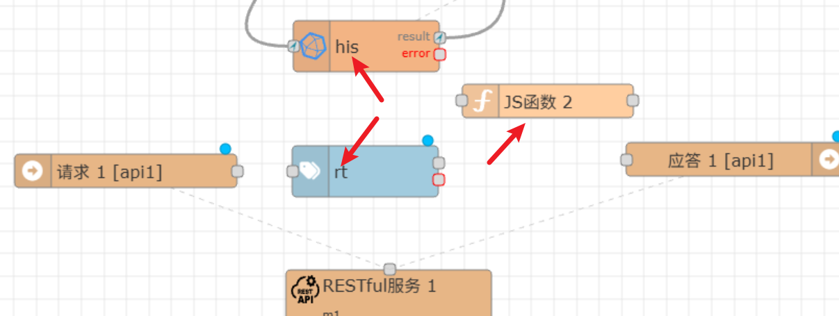 其中,"请求1"节点在上述的URL被访问收到信息时,就会触发消息输出。我们只需要在这个后面接收处理消息,然后把结果输出到"应答1"节点,就会自动完成RESTful的处理和响应过程。