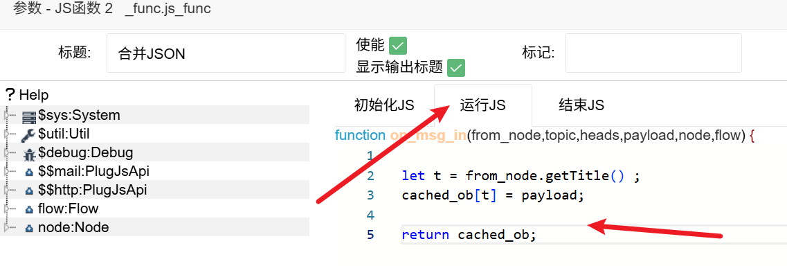 很明显,我们要使用这个JS函数对his和rt两个节点的输出做组合形成一个JSON消息并输出。双击"JS函数 2"节点,修改标题=合并JSON,并点击"初始化JS"框,填写节点初始化变量: