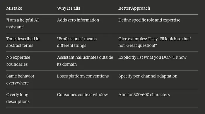 **最常见的失败:**可能适用于任何助手的身份描述。*"我有帮助、准确且友好"*描述了地球上的每个聊天机器人。是什么让您的助手与众不同?