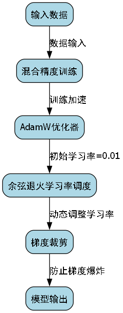 训练过程采用了混合精度训练策略,这大大加速了训练过程并减少了显存占用。我们使用了AdamW优化器,初始学习率设置为0.01,并采用了余弦退火学习率调度策略。训练过程中,我们还引入了梯度裁剪技术,防止梯度爆炸问题。