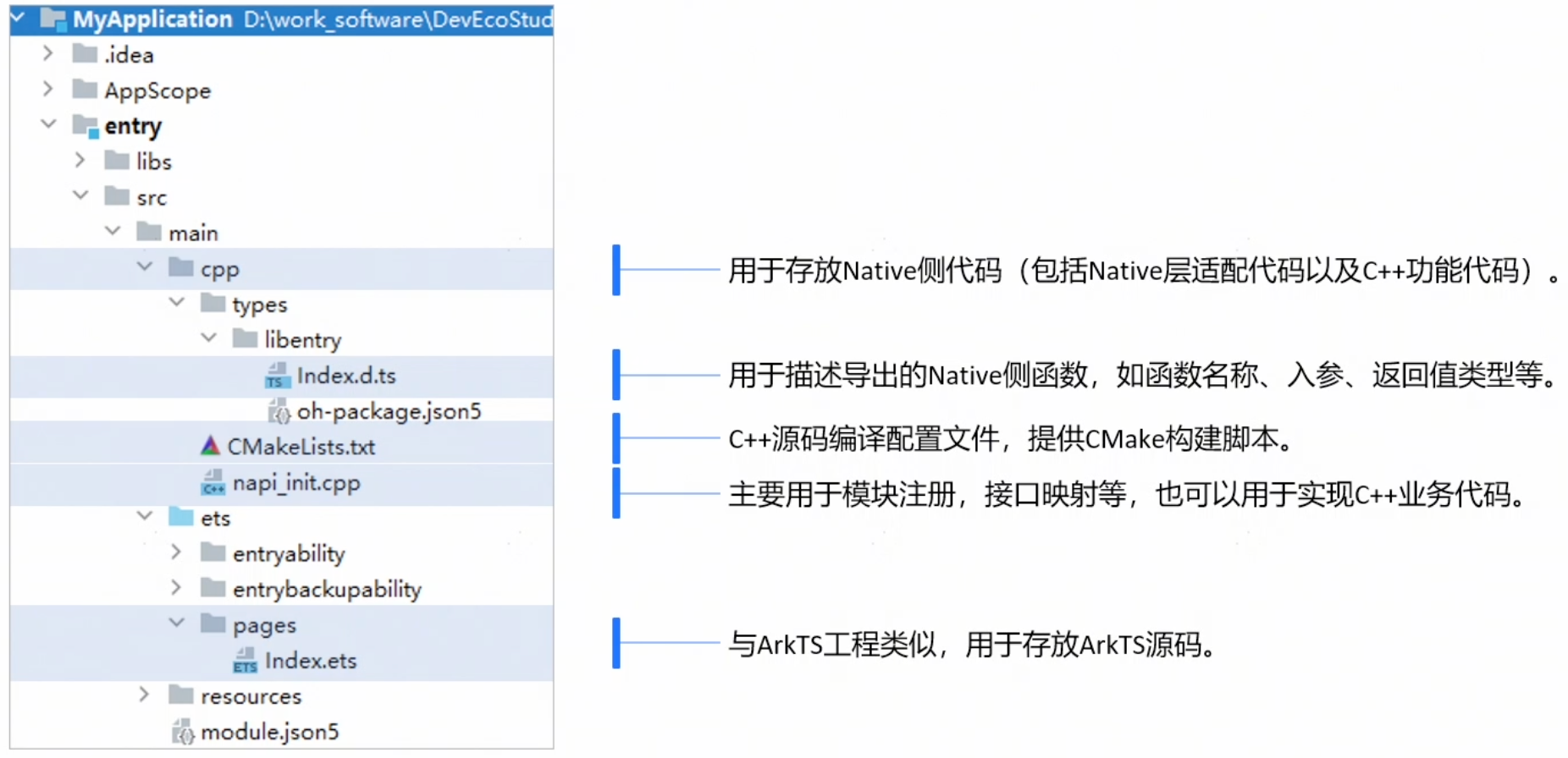 创建工程后工程结构可以分两部分,cpp目录部分和ets目录部分,工程结构如下图,详细介绍可见C++工程目录结构。