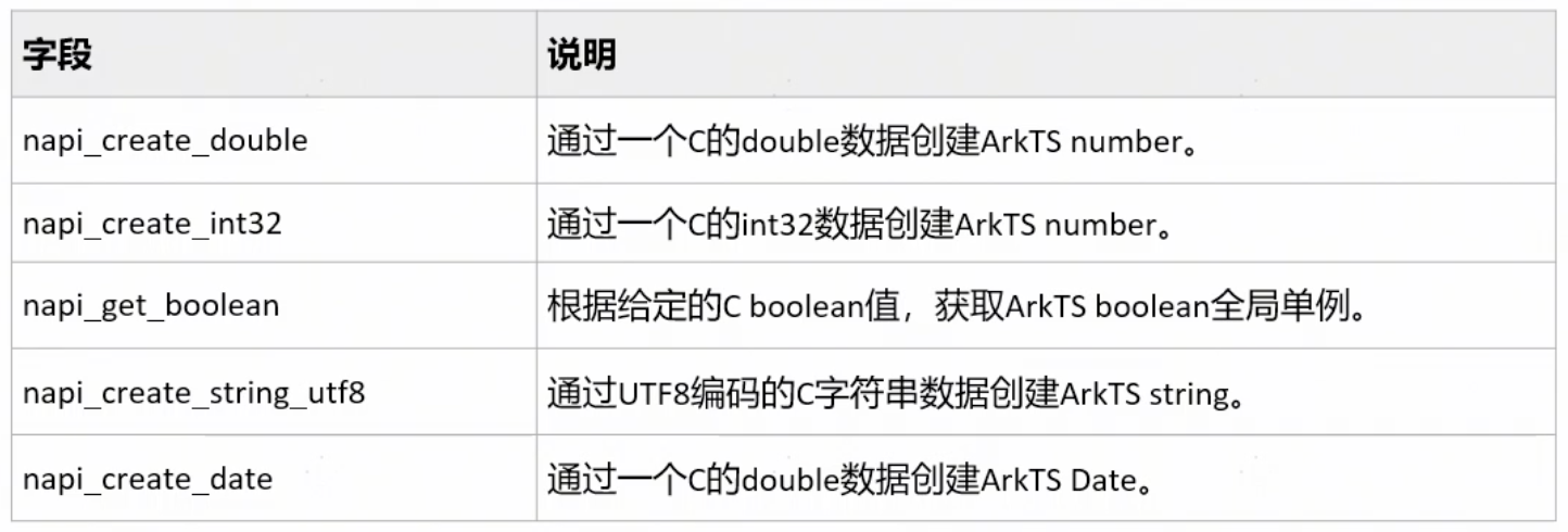 除了将napi_value类型参数转化为C/C++标准数据类型相关接口外,HarmonyOS Node-APl还提供了一些将C/C++标准数据类型参数转换为napi_value类型参数的接口。相关类型接口较多,下面只列举部分基础数据类型相关接口。
