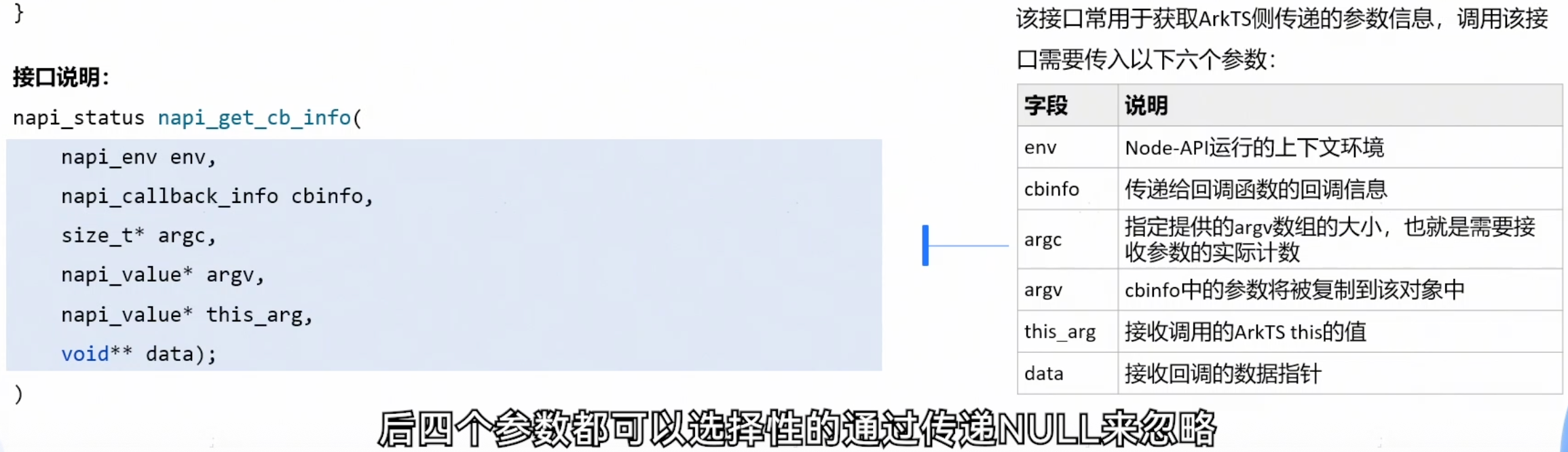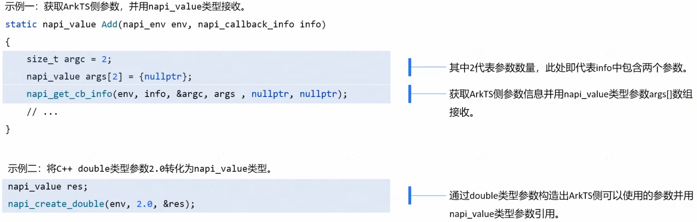 一般作为Native侧函数的参数来使用,在ArkTS侧调用Native侧函数时,默认会传递napi_env和napi_callback_info这两个参数信息。注意:native提供给ArkTS的函数必须有且只有这两个参数。