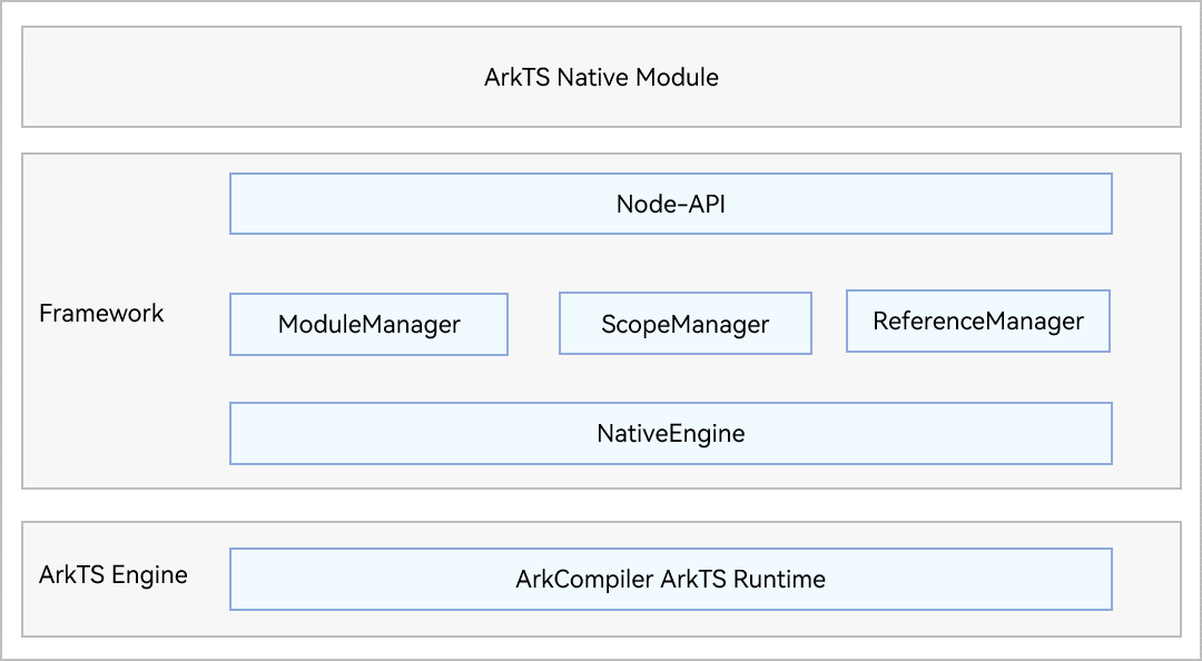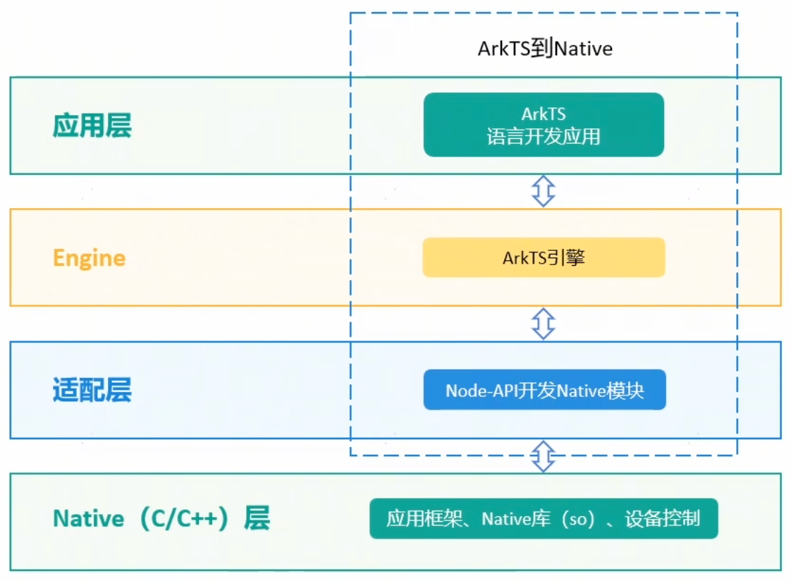 系统可以将框架层丰富的模块功能通过Node-API的模块注册机制对外暴露ArkTS/JS的接口,将C/C++的能力开放给应用的ArkTS/JS层。