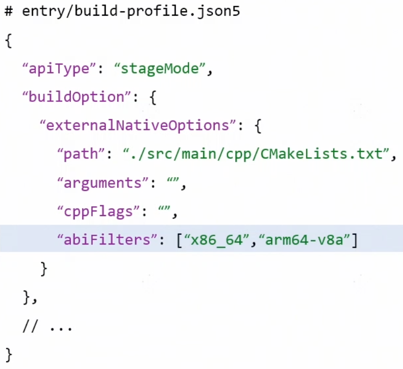 模块级build-profile.json5文件中externalNativeOptions参数配置NDK工程C/C++文件编译参数,可以通过path指定CMake脚本路径、arguments配置CMake参数、cppFlags配置C++编译器参数、abiFilters配置编译架构等。举例如下: