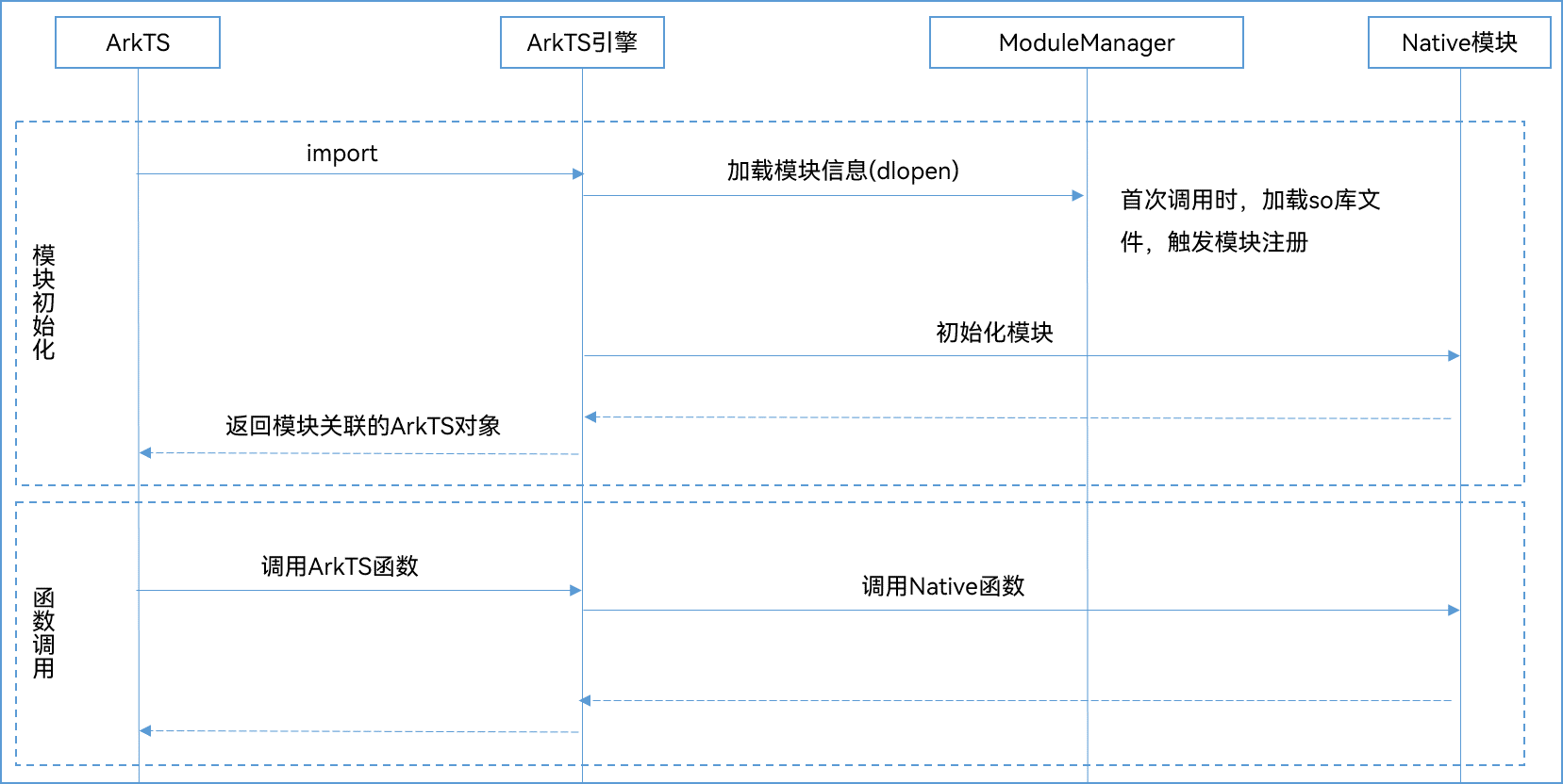 上图中ArkTS引擎和ModuleManager都是由系统管理的,开发者仅需要关注ArkTS模块与Native模块。ArkTS与Native模块间的调用时序图如下所示
