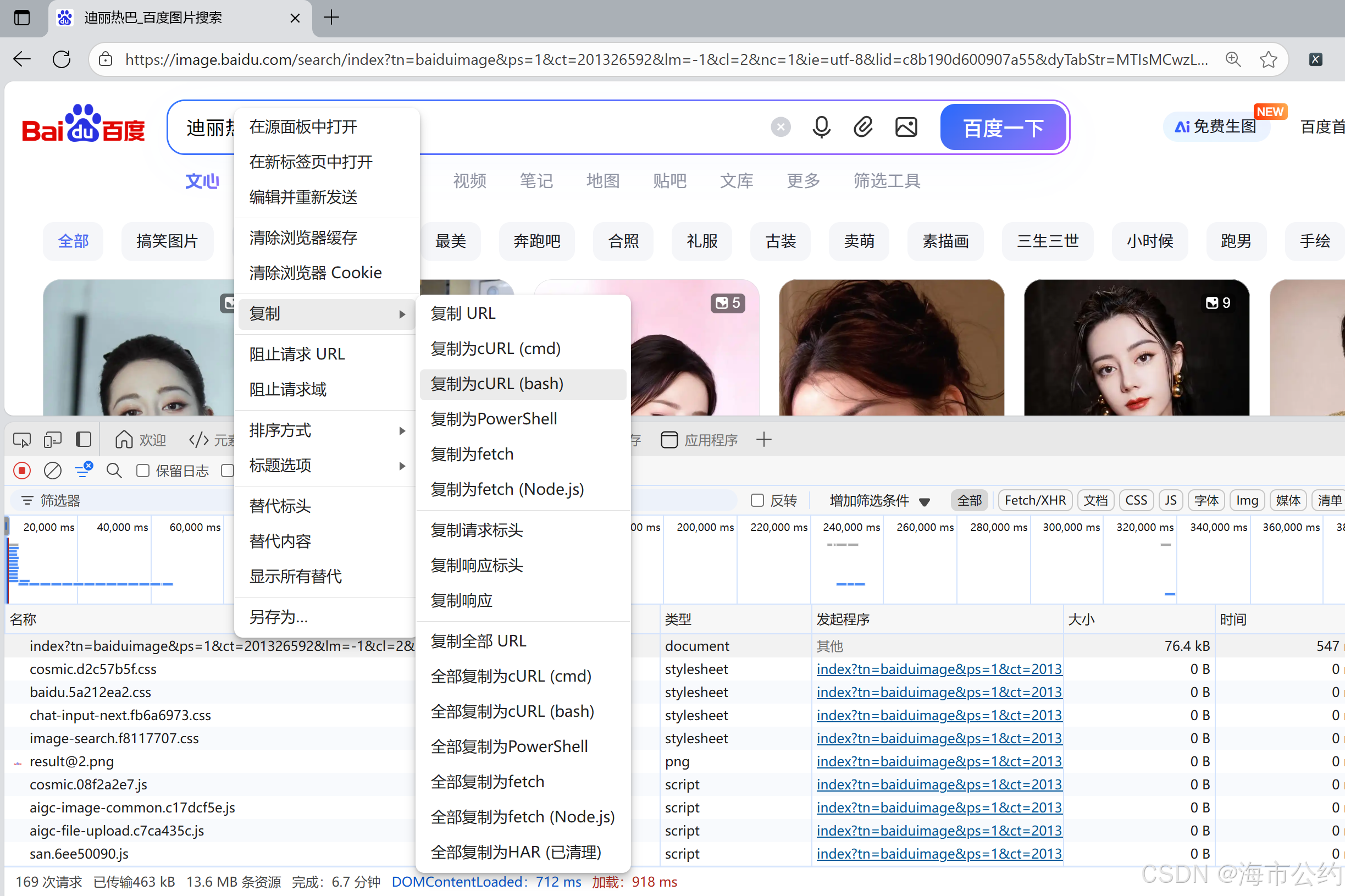 注:上述的headers、cookies、params这些每个人的电脑上是不同的,可以在百度搜索"迪丽热巴"点击图片,鼠标右键、点击检查、点击网络、选择全部、然后刷新。