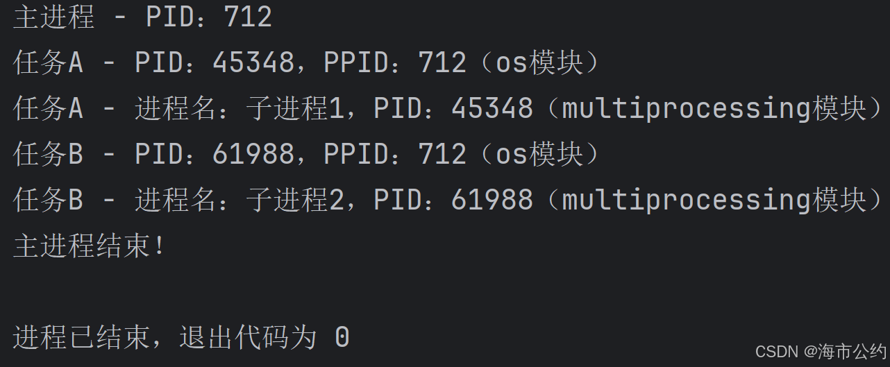 使用多进程时,两个任务可以同时执行(并发或并行),总耗时等于耗时最长的任务耗时。Python中可以通过multiprocessing模块创建多进程。