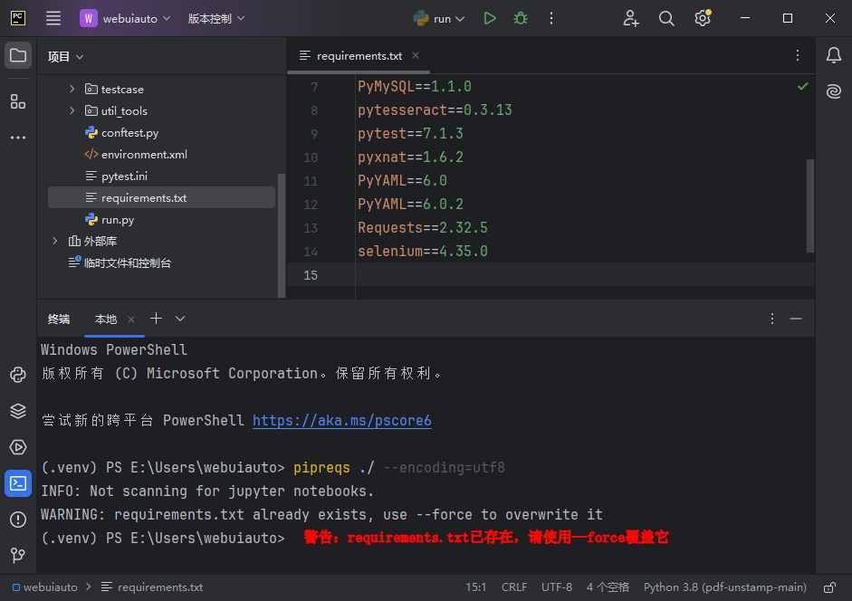 --force 强制覆盖已有的 requirements.txt 文件;
